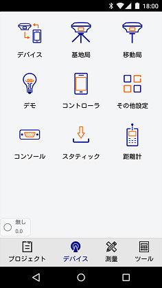デバイス 受信機との接続設定、固定局・移動局の設定、コントローラの設定、スタティック測量の設定 データのエクスポート・インポートなど